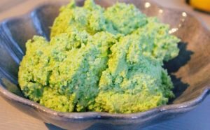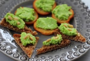 Jag brukar tina de frysta sojabönorna i lite hett vatten en liten stund och sedan bara mixa ihop alla ingredienser i en hushållsassistent. Mixa inte röran helt slät. Den blir extra god om det är lite bitar i den. Lägg upp på trekanter av rågbröd och toppa med några pinjenötter.