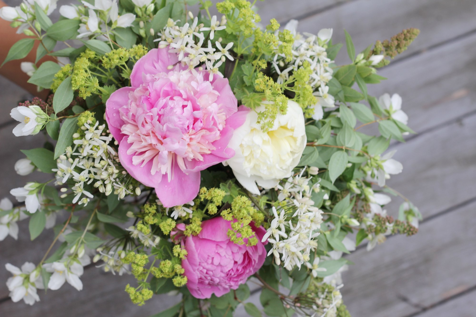Jag tycker det är fint att samplantera växter som passar ihop. Här står en av pionbuskarna tillsammans med en gammaldags lila näva och en hög styvklematis med hängande vita klasar av blommor. Den blir säkert två meter hög varje år och blommar rikligt. Längst ut till vänster i bilden bredvid nävan växer jättedaggkåpor med ett hav av limefärgade blommor. Jättefint att blanda tillsammans med pionerna till buketter! Tyvärr kom de inte med i bilden.