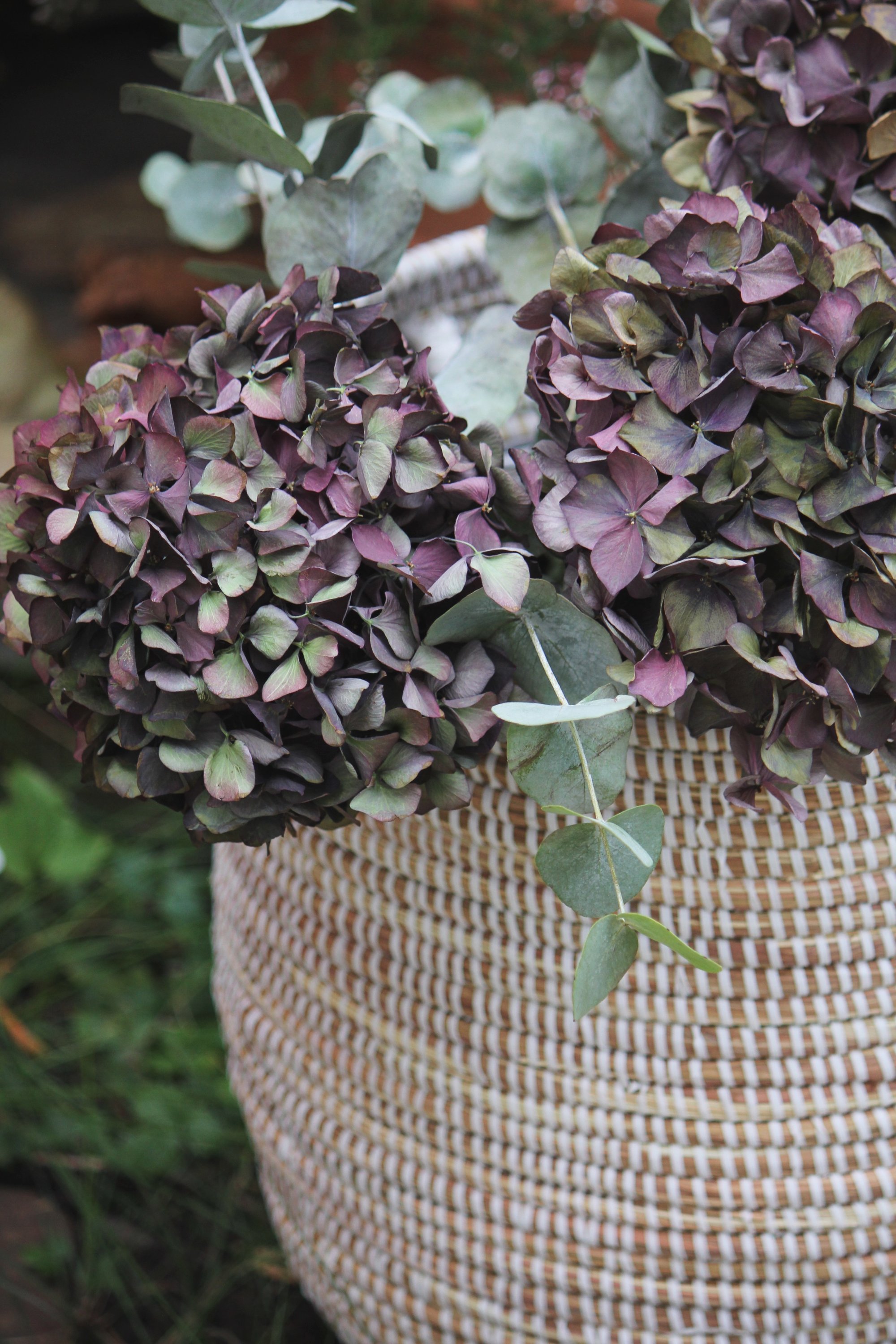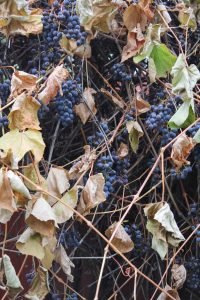 Idag tänkte jag att ni skulle få ta del av lite höstpynt i vår trädgård. De kalla nätterna har förvandlat de gröna frodiga vinrankorna till kala grenar med skrynkliga bruna blad som håller sig kvar. Flera kilo blå druvor dolde sig bakom det gröna bladverket. Vinrankorna bildar ett tak över pergolan. Där under finns ett litet bord, en träsoffa och två stolar. Bigarråträdens löv faller sakta ner till marken och det blir allt kallare om kvällarna. Det känns verkligen att det är Oktober nu.