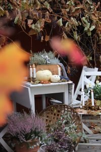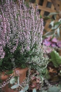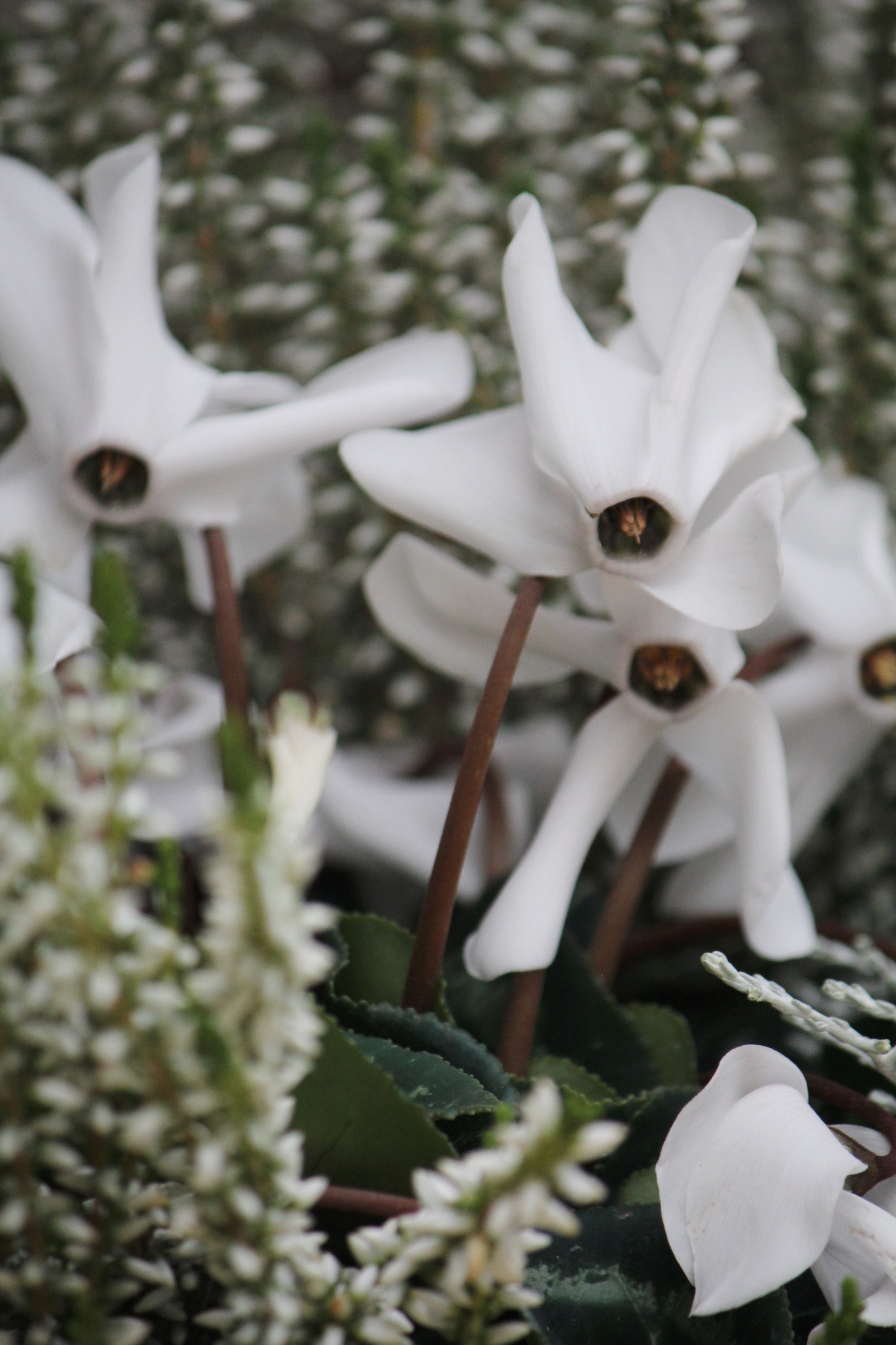 Till höstplanteringarna har jag valt vit ljung blandat med vit cyklamen och gardiland som jag planterat i en gammal trälåda från barnens farmor och farfar. I krukan finns en ljust lila ljung och på stolen vita julrosor.