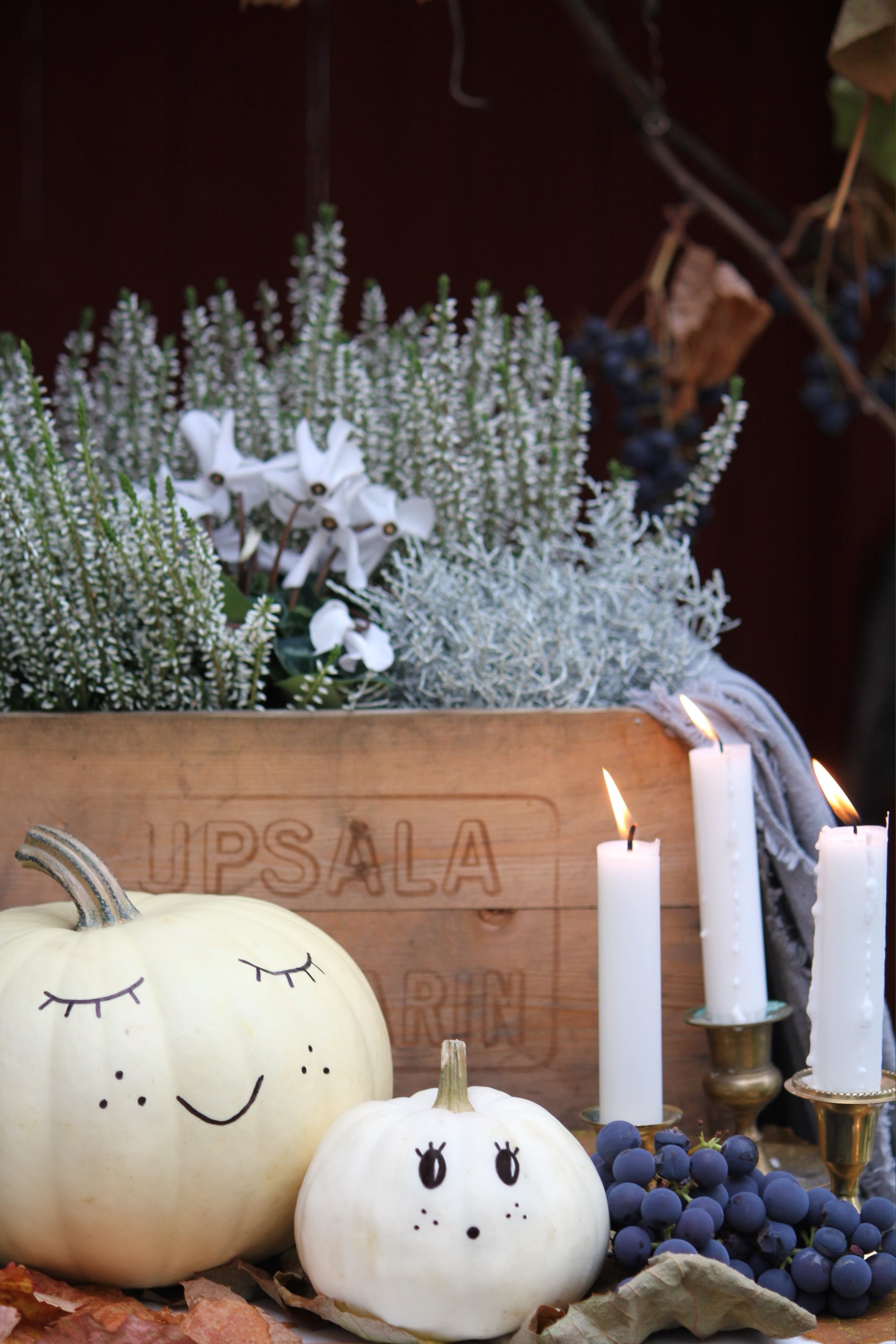 Ni som känner mig vet att jag inte är så förtjust i Halloween när det kommer till alla läskigheter. Vågar ju knappt se en läskig film ha, ha. Jag gillar pumpor men för min del får det bli den snälla varianten. Här har jag målat två vita så kallade spagettipumpor.