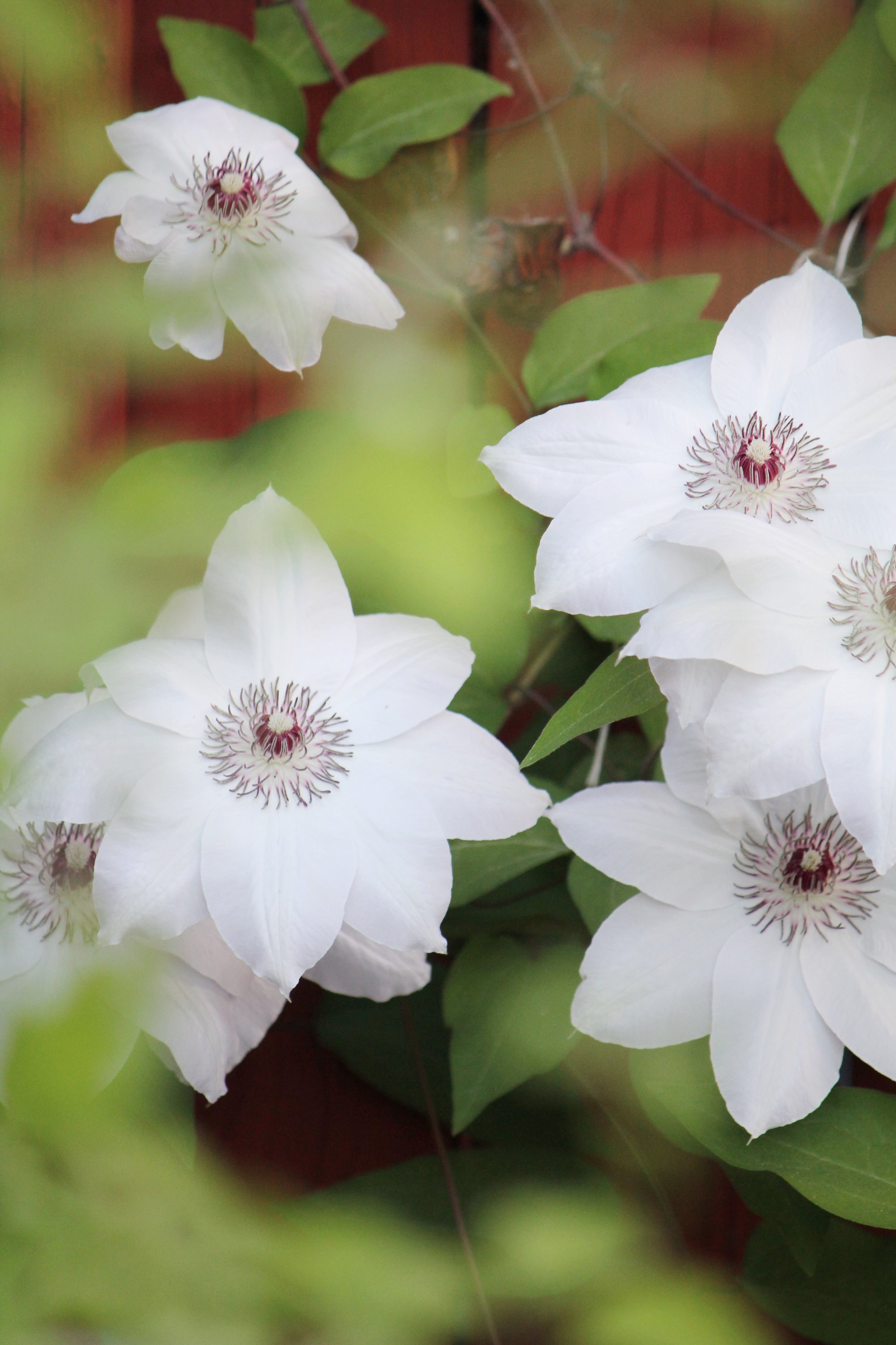 De blommade i maj och har blommat över redan. Nu blommar skönheten på bilden och om ett par veckor kommer våra två andra vita klematis att blomma. De heter Summer Snow och är en snabbväxande klematis som får mängder av mindre vita blommor. De finns vid ingången till trädgården samt intill entrén till huset. Har även en vinröd klematis vid altanen som fanns här när vi flyttade hit och har sedan blivit kvar.