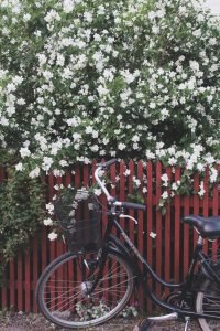 En annan favorit är Schersminbusken. Blommar tacksamt och den kan bli riktigt stor. Det är den som syns på den första bilden med cykeln. Bilden du ser här är vår smultronschersmin. Smultronschersmin doftar alldeles, alldeles underbart. En söt smultrondoft som sprider sig i trädgården. Den vanliga schersminen är så ljuvlig den med. Den har en mer "blommig doft" och kan bli större. Jag tycker det är jättefint att ta in kvistar och sätta i vas eller blanda dem med snittblommor från perennrabatterna. Schersminer trivs i näringsrik jord och behöver beskäras för att bli täta och fina. Man gallrar ur busken och tar bort döda grenar eller någon äldre gren som sitter så att det blir för tätt. Man kan ta av grenen en bit från marken.