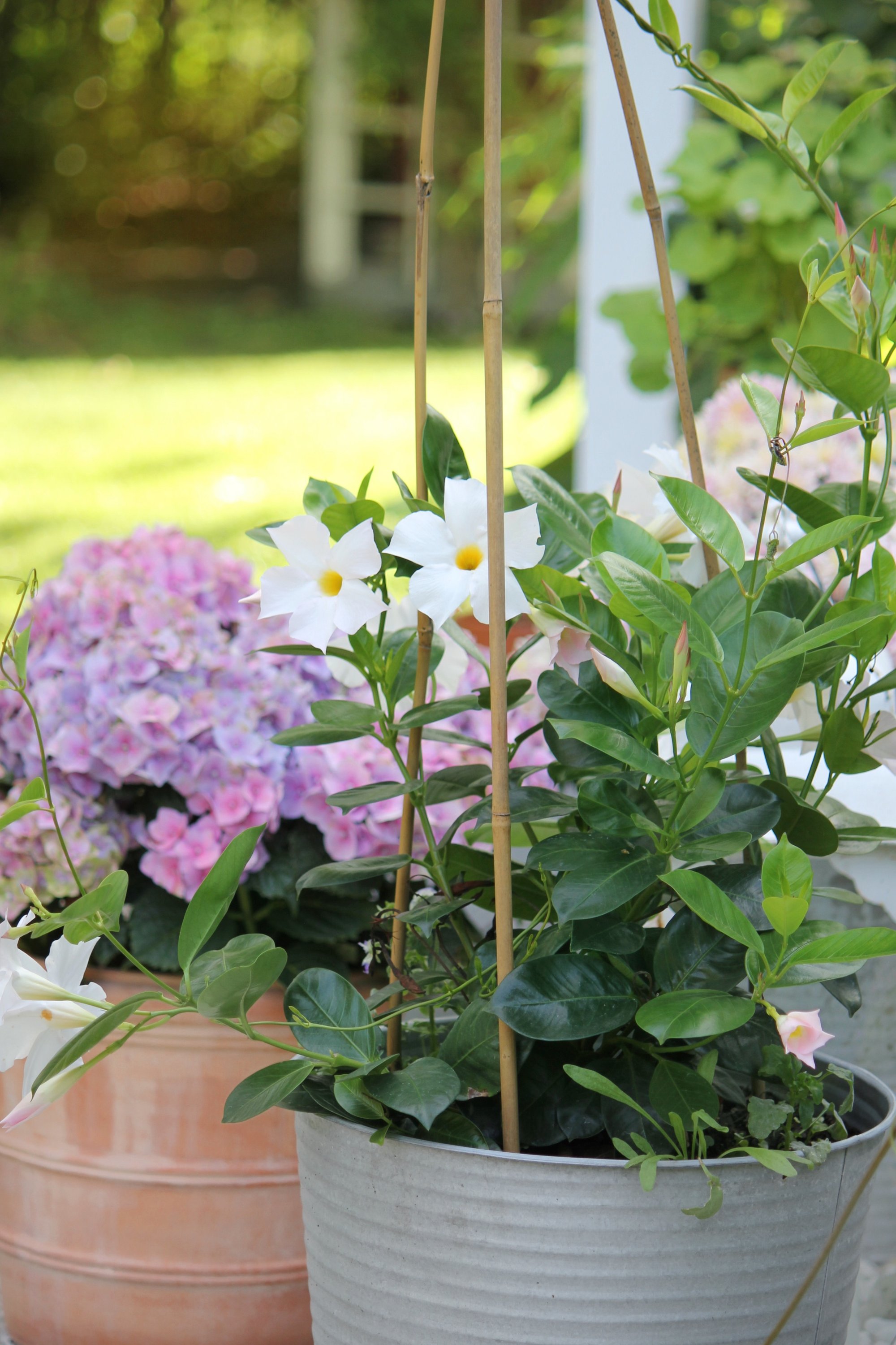 Här kommer ett tips till dig som vill ha en växt som blommar precis hela sommaren. Bägarranka eller Mandevilla som den också heter. Kostar ca 250 kr ute i handeln men är väl värd sitt pris då den producerar nya blommor hela säsongen. Man behöver bara ta bort de överblommade blommorna. Bägarrankan har tjockare blad och klarar därför torka lite bättre vilket är en fördel en varm sommar. Den vill ha växtstöd att klättra på. På bilden har jag satt ihop tre tunna bambupinnar med ett snöre längre upp.
