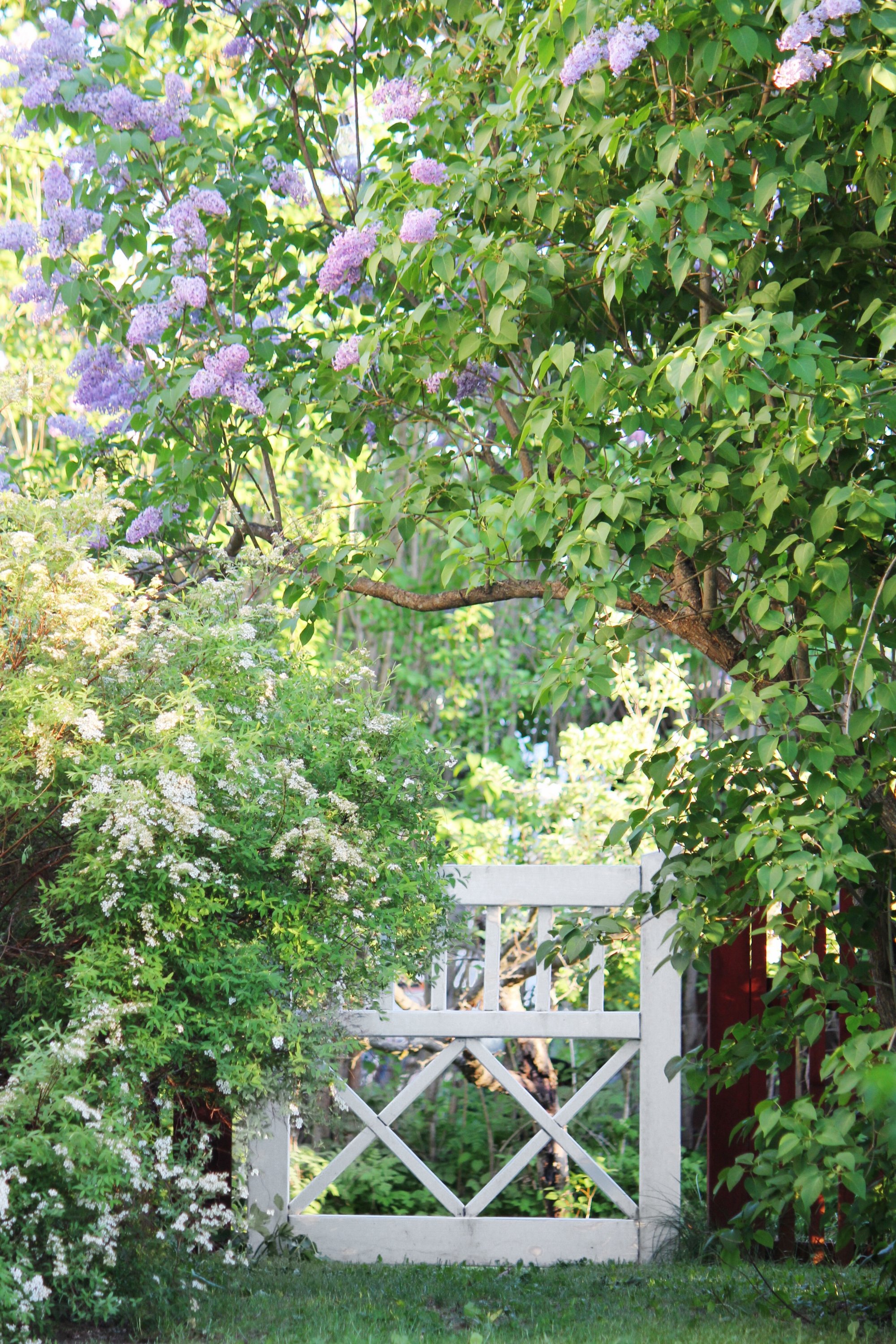 Idag och imorgon kommer temat på bloggen vara trädgårdsentré. När vi flyttade till huset fanns en huvudentré i form av en större träportal som fortfarande finns kvar. Mer om huvudentrén imorgon. Trädgården har även en annan lite undangömd hemlig ingång där vi numera har en vit trägrind med kryss. Älskar kryss på grindar. Denna finns att köpa färdig men på nätet finns ritningar om hur man snickrar ihop den själv. Till höger står en jättestor lavendellila syrenbuske som jag låtit växa över grinden nästan som i en båge för att få den där portalkänslan. Till vänster står en stor vit spirea. När dessa två blommar samtidigt blir ingången magisk. Ingången fyller även sin funktion då inte små barn kan "rymma" ut från tomten :).