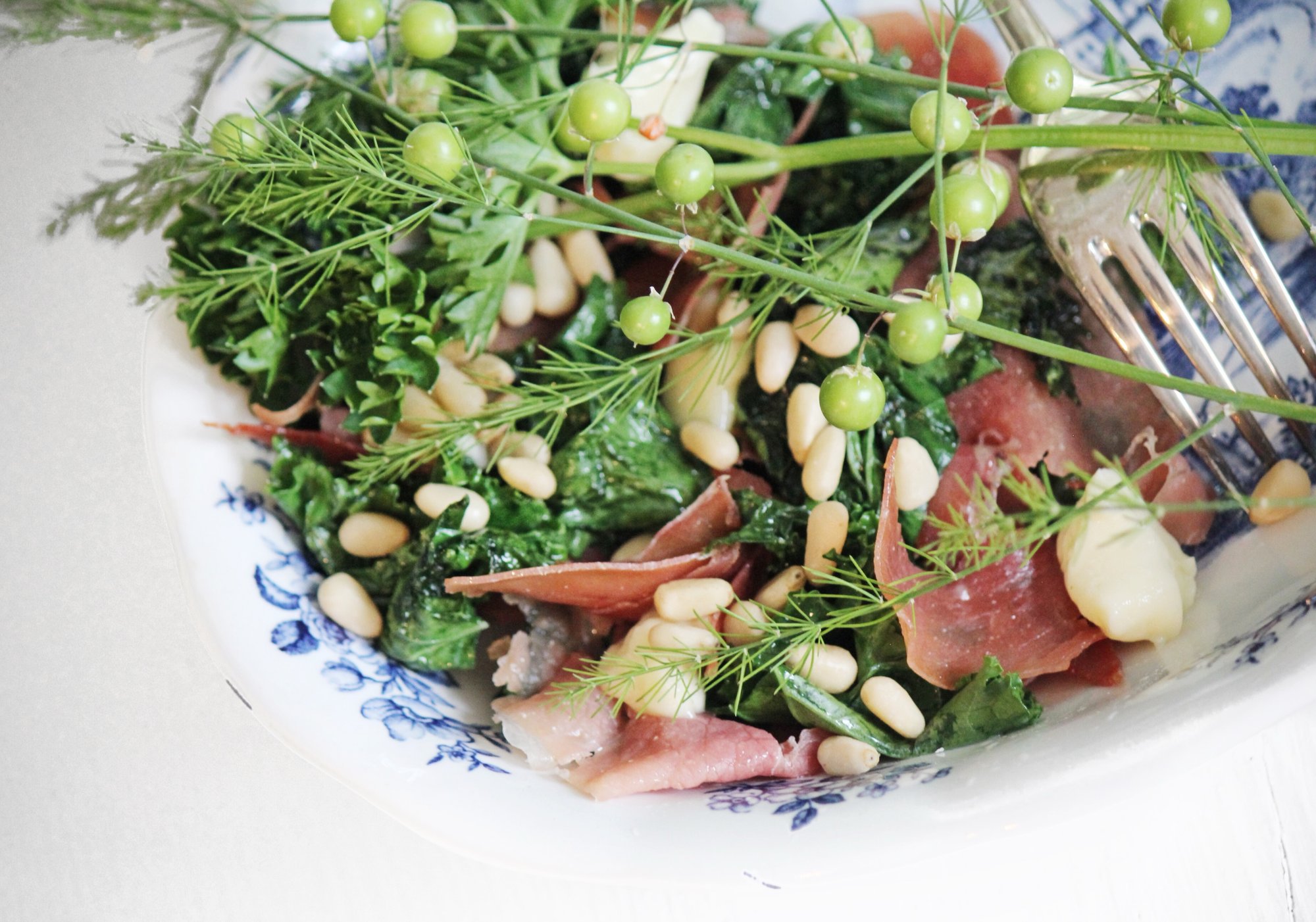 Wokad grönkål och serrano med brie och pinjenötter