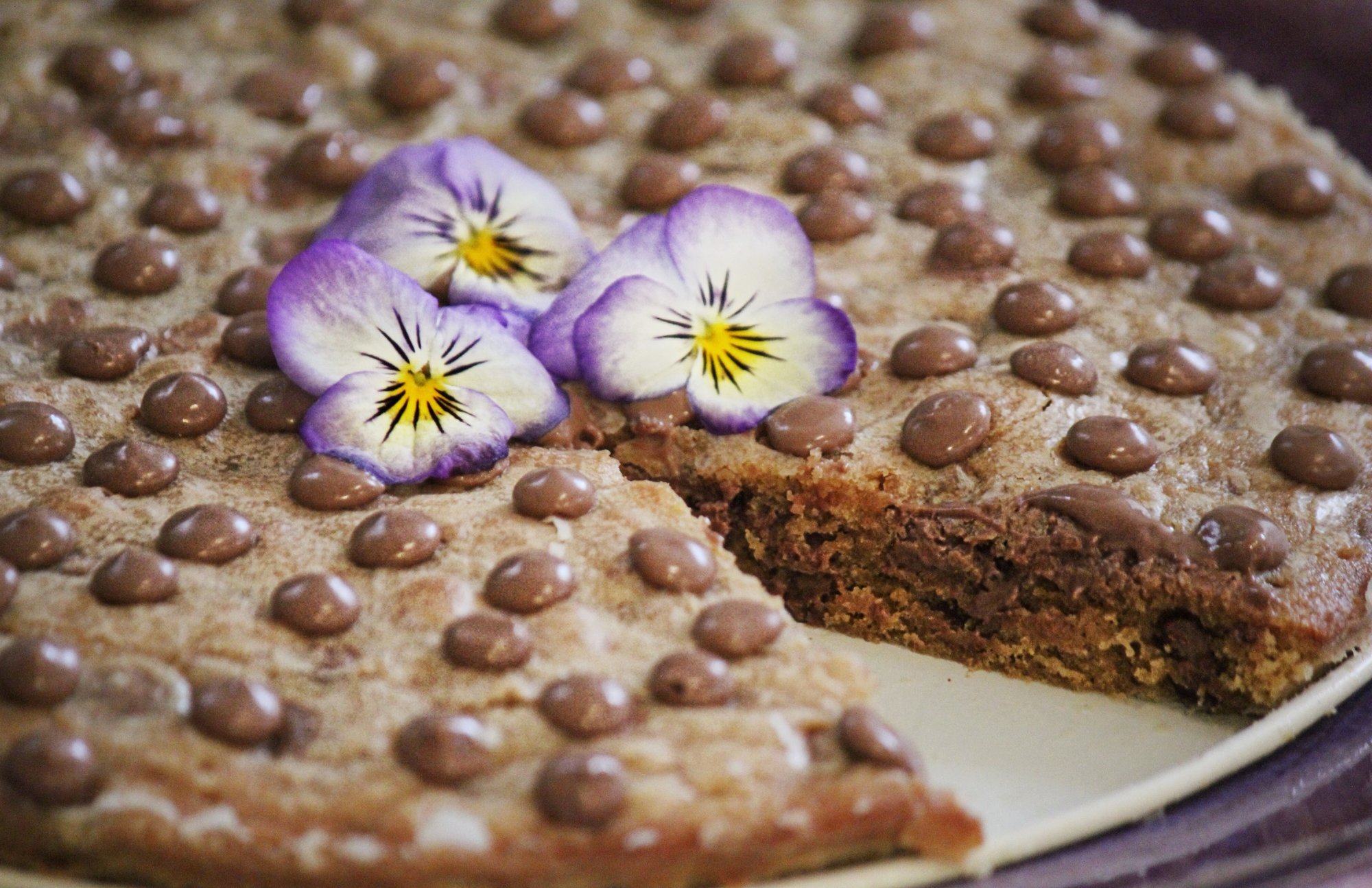 Röd dag och riktigt vårigt regnväder ute. Då passar det kanske bra att mysa inomhus och baka. Här kommer ett superenkelt och snabbt recept för er som älskar Chocolate chip cookies och kladdkaka. Man rör bara ihop alla ingredienser och gräddar ca 15 min. Enklare kan det inte bli. Den blir som en jättestor nygräddad seg Chocolate Chip Cookie!!! Receptet är från Fridas bakblogg. Kakan dekorerade jag med några penséer. De är ju ätbara.