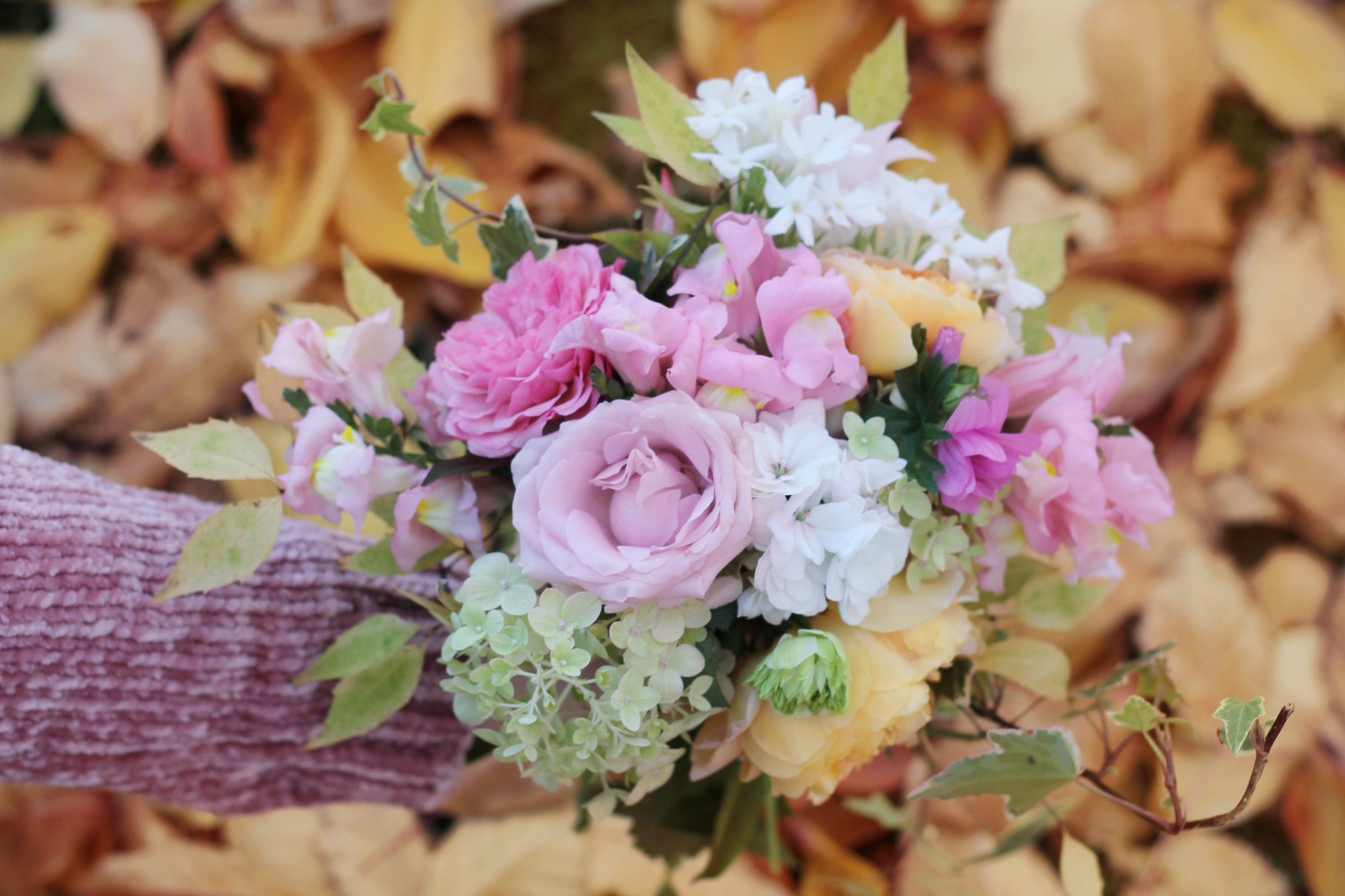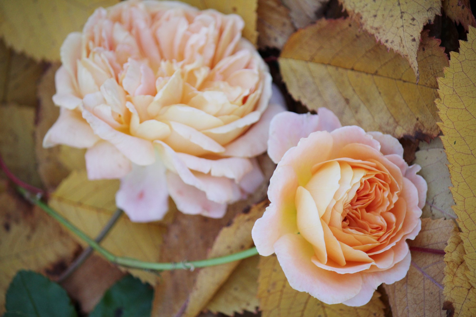 Blommor från trädgården i Oktober. Rosor, hortensia, höstanemon och lejongap.