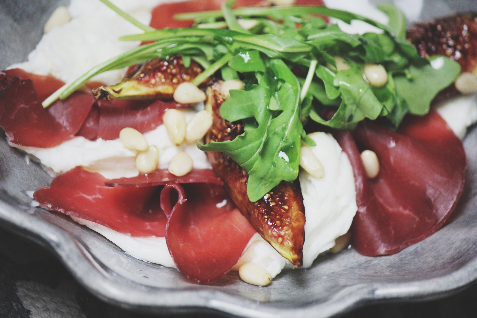 Du hittar det goda receptet här om du är nyfiken: Förrätt med glaserade fikon, breasola, mozarella, ruccola och pinjenötter