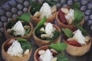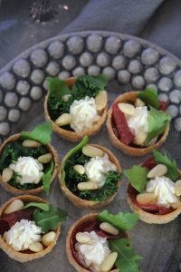 Lägg i en bit av Breasola i botten av krustaden. Spritsa ut en klick med gräslöksost. Toppa med ruccola och pinjenötter.