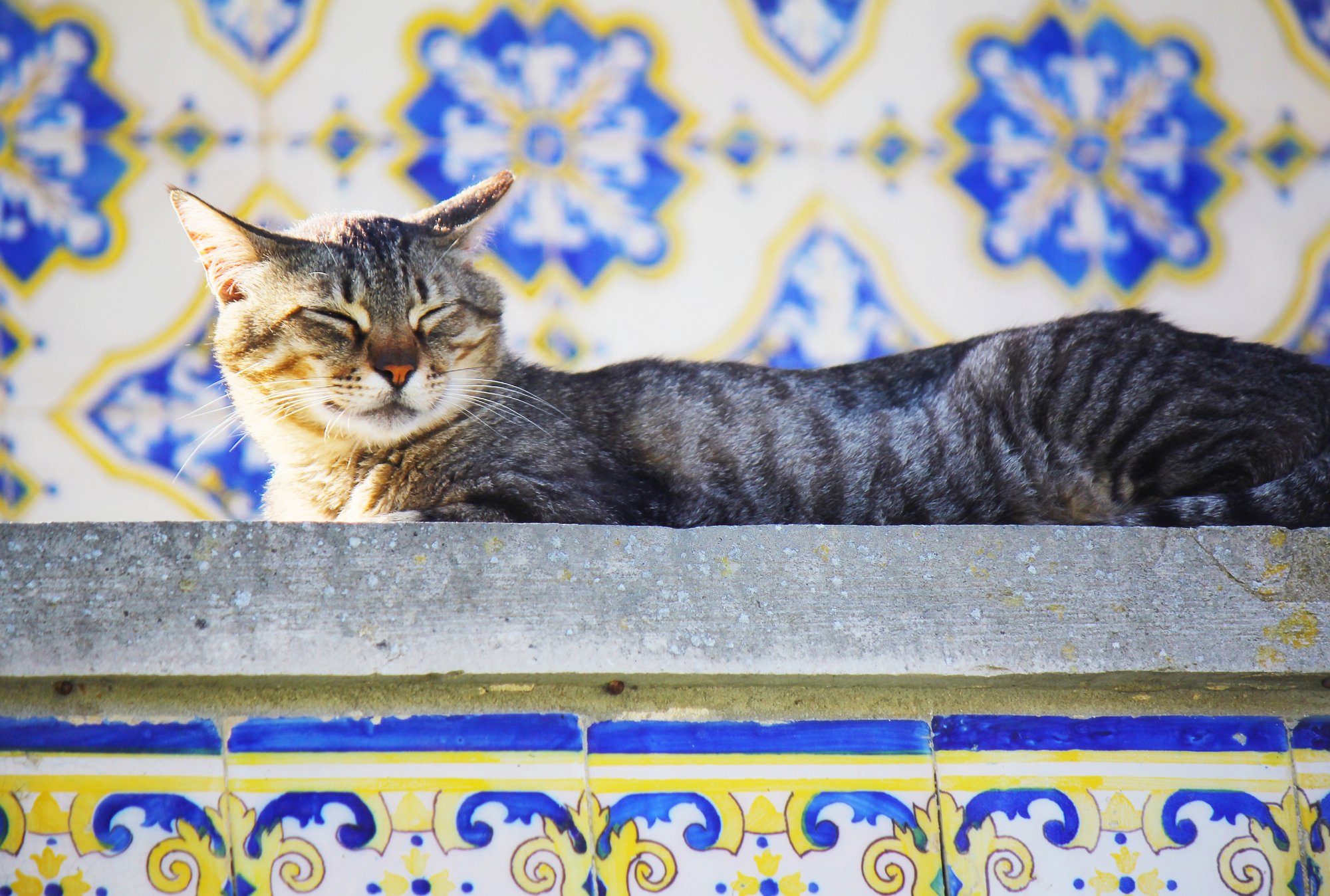 Utsikt över berg, flera olika slott och fästningar. Staden Sintra! Vi promenerade runt och stannade för middag med grillad lax. Fisk är något de är bra på i Portugal. Flera av husen vi strosade förbi hade vackra blanka kakelplattor i det allra finaste blå mönstret. En liten katt låg och vilade i kvällssolen.