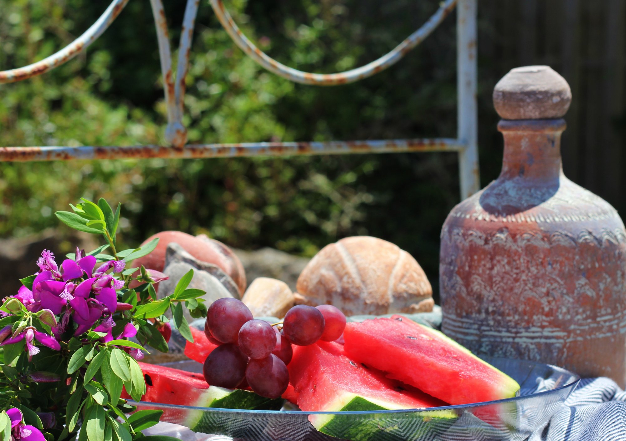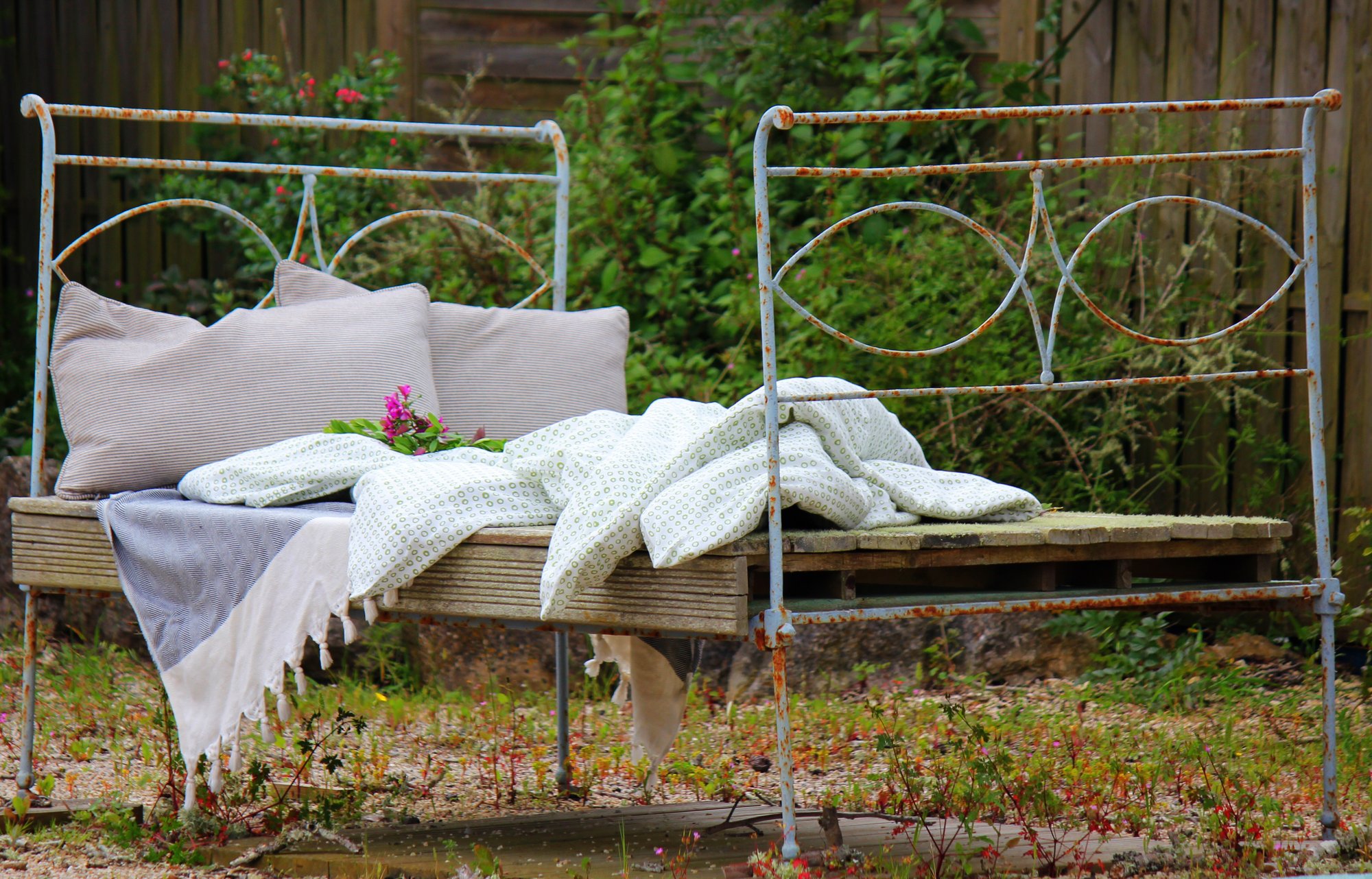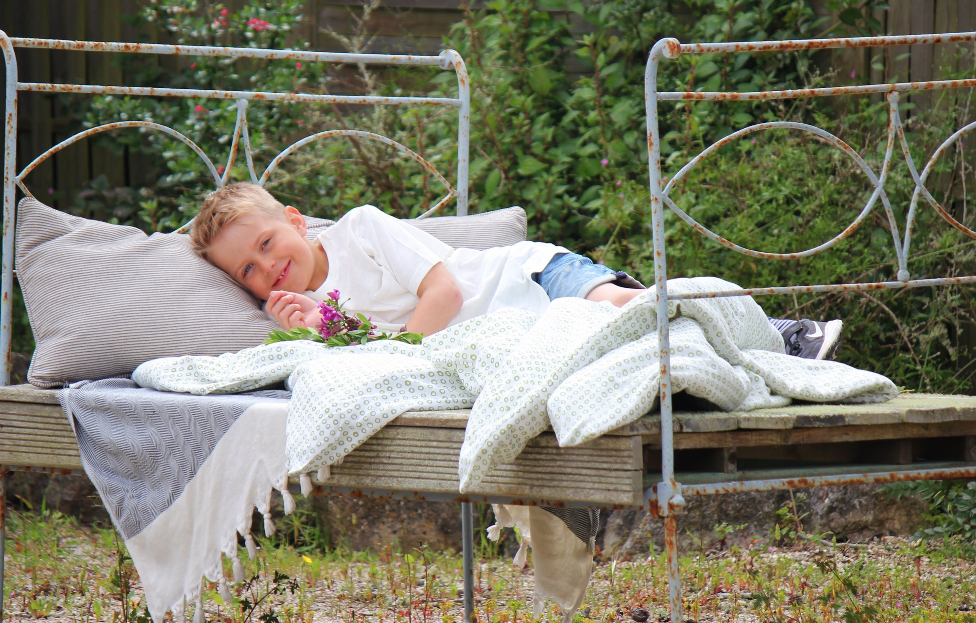 Morgonen efter åt vi en härlig frukost med färsk frukt. Det stod en gammal övergiven säng alldeles under ett träd. Genast fick den nytt liv med några mysiga täcken och kuddar och blev en perfekt plats för lite mysfrukost. Utsikten är magisk utöver regnskog och långt där borta ett gammalt stenslott.
