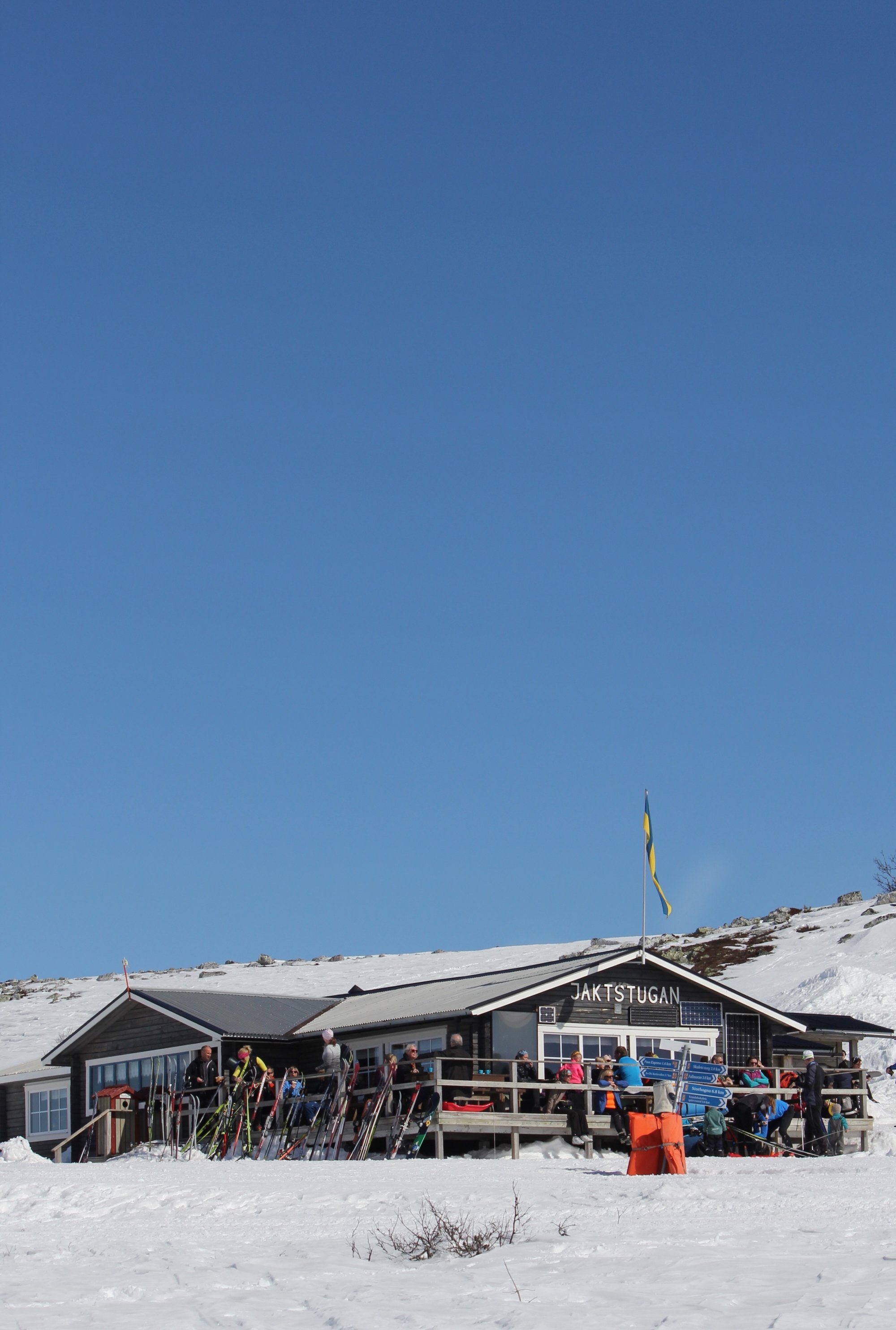 I stugan serveras enklare fika och våfflor men vi hade med egen matsäck också. Vi slog oss ner i en solgrop och bara hade det bra. Jaktstugan lånar ut pulkor och stjärtlappar till barnen om man vill åka pulka på bergen.